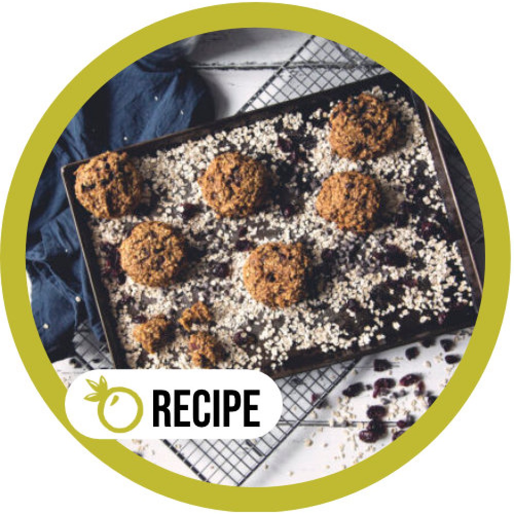 Preheat oven to 350°F and line a cookie sheet with parchment paper. Combine oats, flour, coconut, spices, baking powder, and salt in a medium mixing bowl, stirring to combine. In a separate bowl, whisk together the maple syrup, olive oil, apple sauce, and vinegar until well blended. Gently stir in the oat flour mixture. When half incorporated, add the cranberries and chocolate chips, and mix until a stiff dough forms with all the flour absorbed. Scoop about 2 tbsp of cookie dough onto a baking sheet, flattening the tops with damp f ingertips or the bottom of an oiled glass. Space cookies 1” apart and bake for 10 to 12 minutes, until golden brown on the edges.